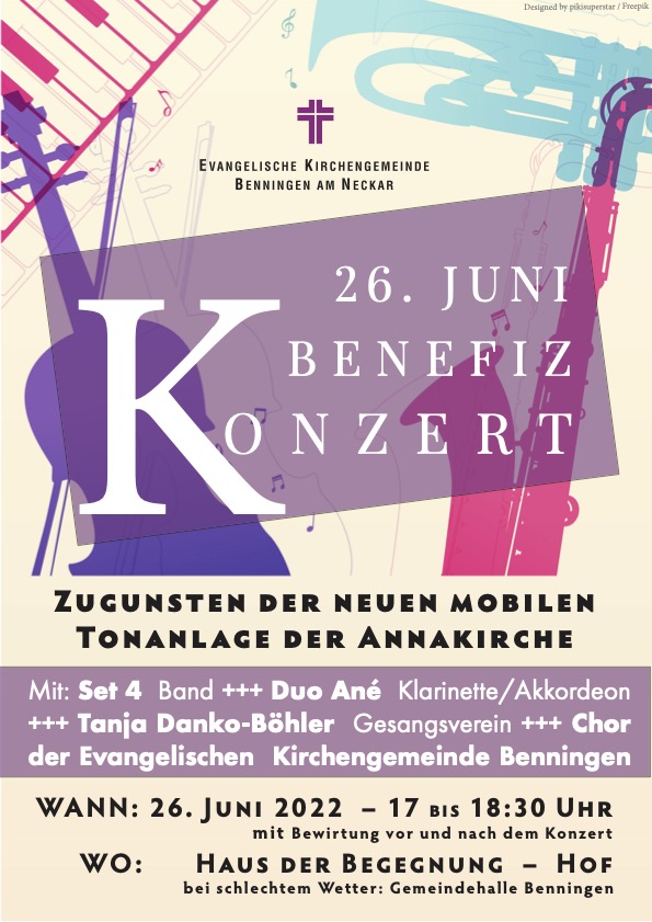 Wie ihr dem Plakat unten entnehmen könnt, veranstalten wir am kommenden Sonntag, 26.06.22, um 17:00 Uhr ein Benefizkonzert im Hof vor dem evangelischen Gemeindehaus in Benningen/Neckar. Es dient der Anschaffung einer mobilen Tonanlage, die sich wunderbar bei Open Air- Veranstaltungen, aber auch bei musikalischen Events in der (dann neu innenrenovierten!) Annakirche einsetzen lässt.